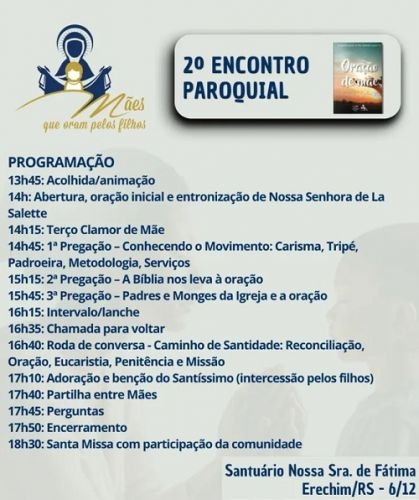 O Grupo de Mães que Oram pelos Filhos completa dois anos de atuação em Erechim e realiza, no sábado, dia 6 de dezembro, o seu segundo Encontro Paroquial. A programação inicia às 14h, no Santuário Nossa Senhora de Fátima, e é aberta à comunidade. O convite se estende a todas as que se identificam com a maternidade em suas muitas formas: mães, avós, tias, madrinhas, gestantes, tentantes, mães de coração e mães de anjos.