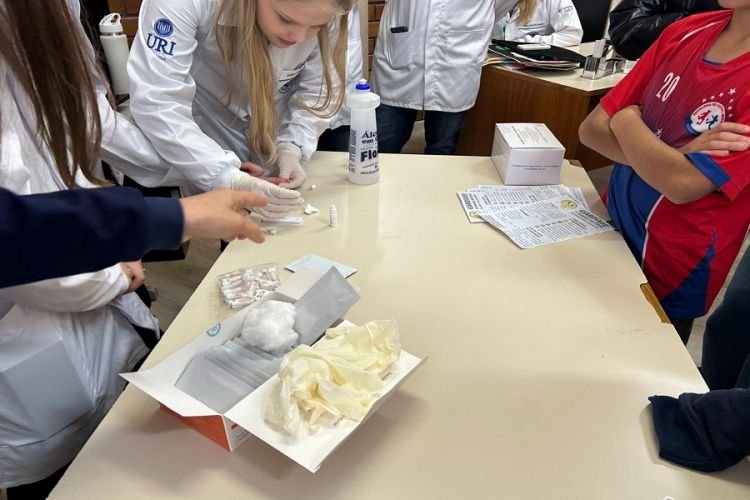 Acadêmicos do Curso de Medicina desenvolvido, na Unidade Básica de Saúde do Bairro Progresso, de Erechim, uma atividade de extensão curricular sobre Giardíase e Sífilis. O trabalho foi conduzido pelos alunos Antônio Melquisedeque, Fernanda Vanz, Isabelli Szymanski Busanello, Jéssica Steinhorst, Vinícius Biasi e Vitor Rossatto, orientados pelas professoras Rozane Restello e Mariluce Jaskulski e pelas preceptoras da UBS Progresso, Indiamara Deggerone (médica) e Cláudia Baccin (enfermeira).
