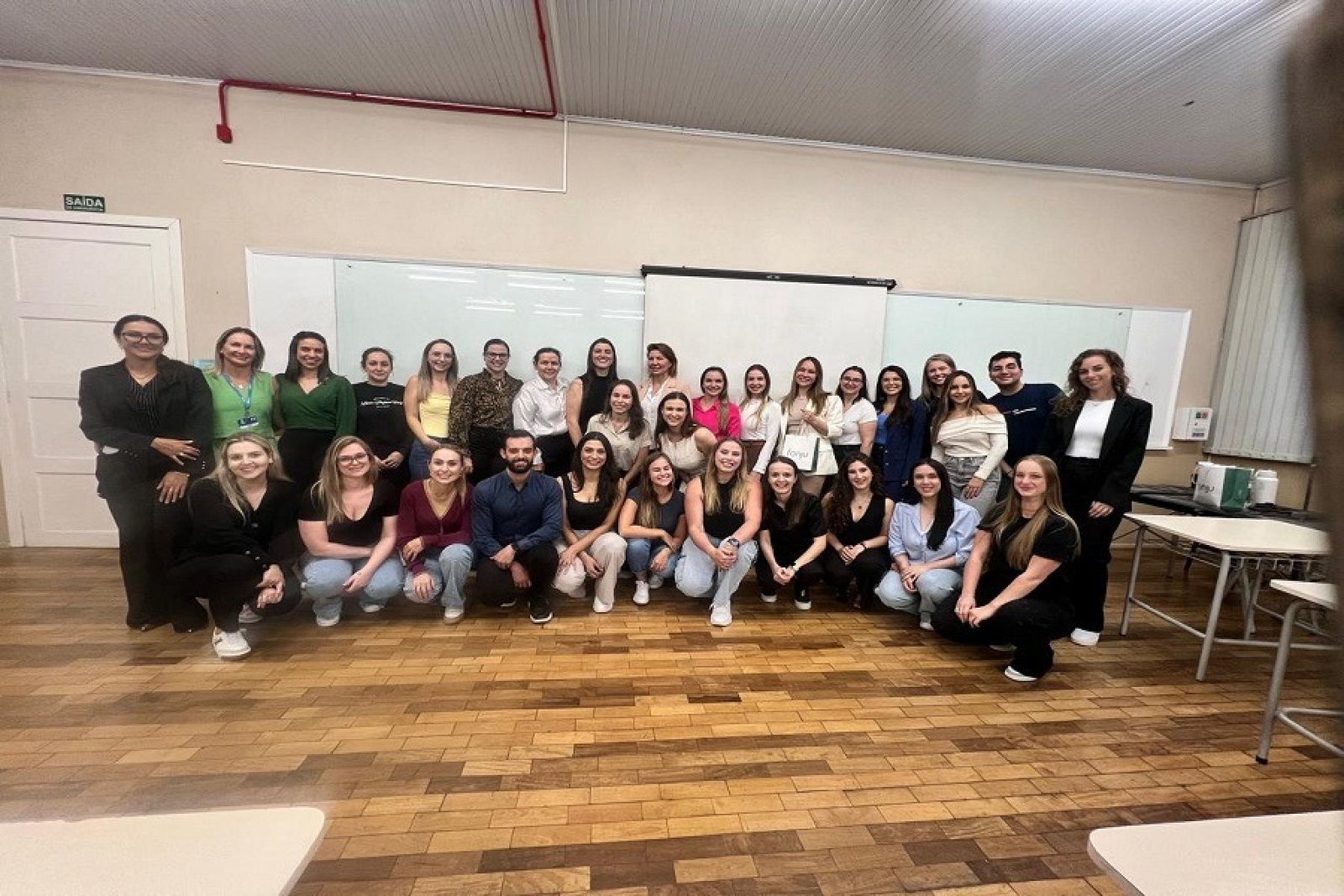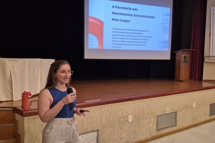 Na sequência, a farmacêutica bioquímica Karin da Lara, da Fundação Hospitalar Santa Terezinha de Erechim, apresentou a palestra “Da teoria à prática: relatos de uma trajetória na farmácia”, compartilhando experiências da formação acadêmica e da atuação profissional, relatando os caminhos percorridos desde o ingresso no curso até a atuação em análises clínicas.