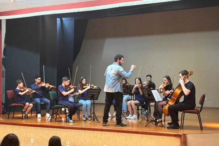 Um dos momentos mais significativos da noite foi à apresentação no formato de orquestra, uma iniciativa que vem se fortalecendo na escola. O grupo incluía não apenas os violinos, mas também instrumentos como violoncelo, violão e baixo.