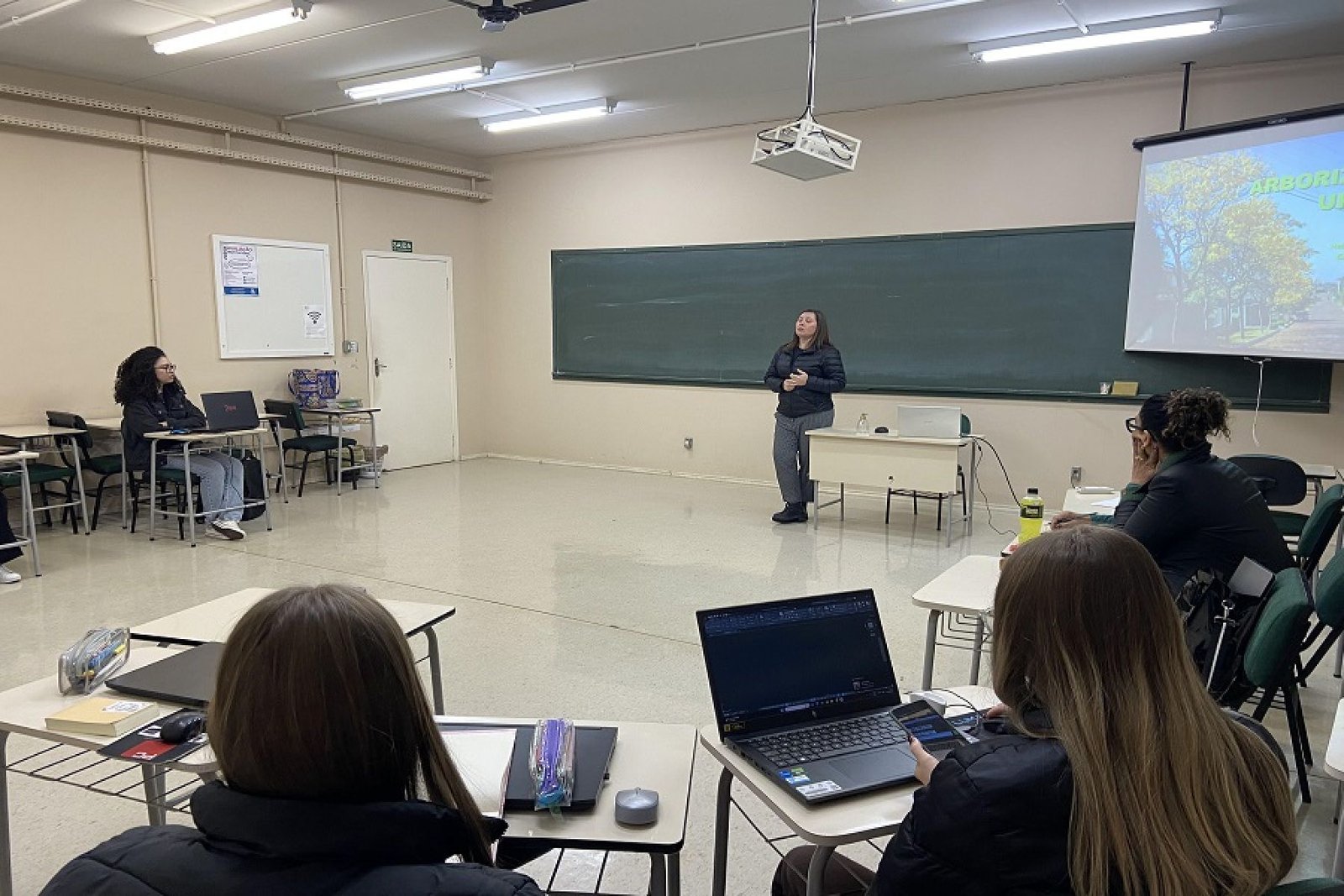 Acadêmicos da disciplina de Estudos Ambientais, do Curso de Arquitetura e Urbanismo da URI Erechim, participaram, na segunda-feira, 15, de uma formação sobre arborização urbana, ministrada pela Engenheira Agrônoma Halina Kluch, servidora da Prefeitura de Erechim. O encontro proporcionou aos estudantes um momento de aprendizado teórico e prático, abordando temas essenciais para o planejamento urbano sustentável, além de apresentar projetos e iniciativas que estão sendo desenvolvidos no município, conectando a teoria desenvolvida em sala de aula com a realidade local.