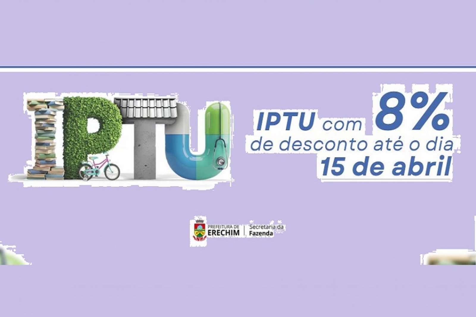 A Prefeitura de Erechim, por meio da Secretaria Municipal da Fazenda, informa que os contribuintes ainda podem garantir desconto no pagamento do IPTU 2026 em cota única. Quem quitar o imposto até o dia 15 de abril terá 8% de desconto.