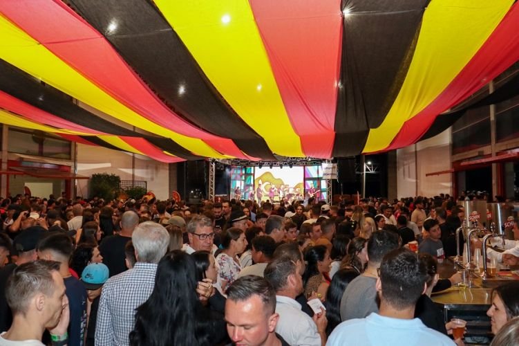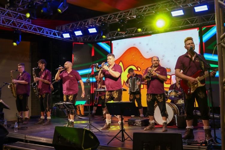 Logo após a solenidade de abertura, a Banda K'necus subiu ao palco e deu início à festa, contagiando o público com seu repertório vibrante. A plateia respondeu com entusiasmo, dançando e cantando ao som dos sucessos que embalaram na primeira noite da Oktoberfest.