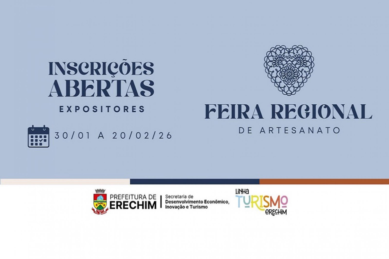 A Prefeitura de Erechim, por meio da Secretaria Municipal de Desenvolvimento Econômico, Inovação e Turismo, lançou o Edital de Chamamento Público Nº 003/2026, que trata do credenciamento de expositores para a 1ª Feira Regional de Artesanato do Norte do Estado do Rio Grande do Sul. O evento será realizado nos dias 13, 14 e 15 de março de 2026, no Parque da ACCIE, e tem como objetivo promover, valorizar e impulsionar o artesanato regional, integrando municípios e fortalecendo o turismo e a economia criativa.