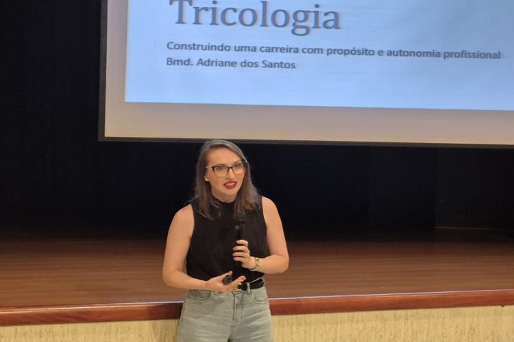 Encerrando a programação, a biomédica Adriana dos Santos contribuiu com a palestra “Da Biomedicina à Tricologia: construindo uma carreira com propósito e autonomia profissional”, quando abordou a ampliação das áreas de atuação da biomedicina e aspectos específicos de sua trajetória profissional. Comentou sobre sua experiência inicial em análises clínicas e o processo que levou a direcionar sua carreira para a área da tricologia, campo voltado ao estudo e tratamento das doenças do couro cabeludo e dos cabelos.