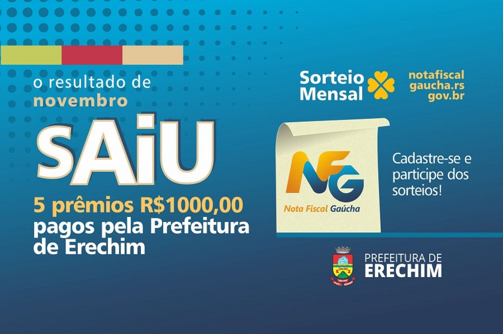 A Secretaria Municipal da Fazenda e a Secretaria Municipal de Educação, por meio da Comissão de Educação Fiscal do Município de Erechim, divulgam os nomes dos ganhadores do mês de novembro da Nota Fiscal Gaúcha (NFG), do concurso 146, com sorteio no dia 28 de novembro.