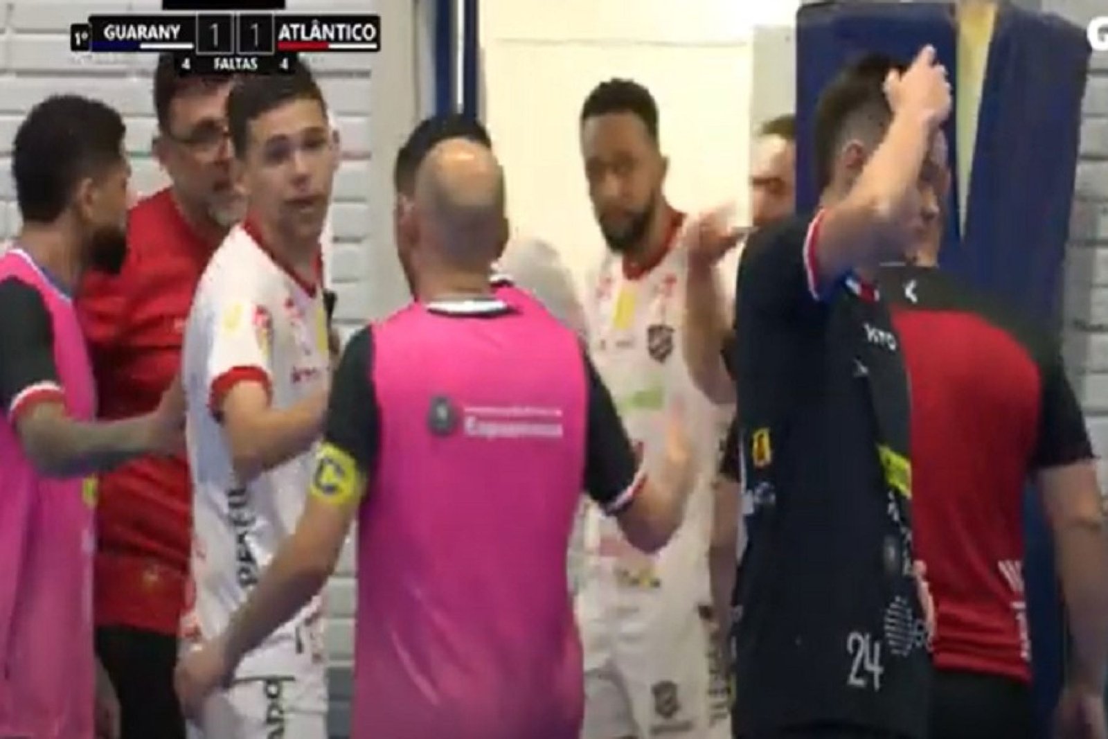 A partida foi interrompida depois que o goleiro João Paulo, do Atlântico, relatou ter sido chamado de “macaco” por um torcedor que estava no Ginásio Módulo Esportivo, em Espumoso. A equipe de Erechim optou por sair de quadra e não retornar.