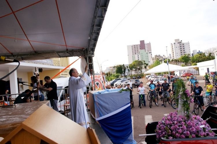 Em frente ao palco das celebrações, Pe. Sala motivou os ciclistas a pedalarem firmes e perseverantes no caminho da vida, sabendo levantar-se e obrigação quando passarem por alguma queda como pode acontecer andando de “bike”. Abençoou a todos pela intercessão de N. Sra. de Fátima.